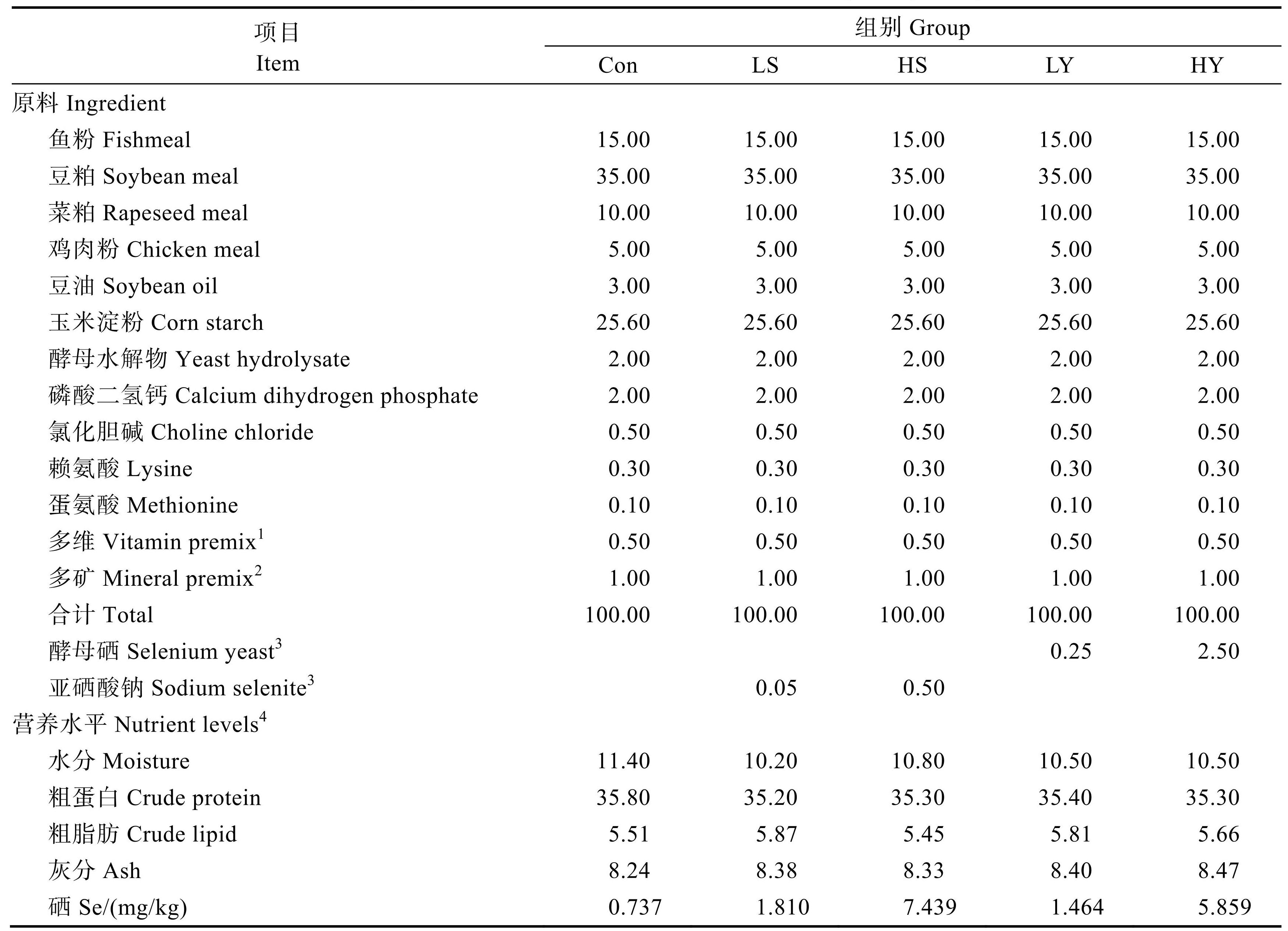 饲料以鱼粉、豆粕、菜粕为主要蛋白源,豆油为脂肪源,按照表1的配方配制各组饲料,对照组(CON)饲喂基础饲料,实验组在对照组基础上添加不同硒源,分别设置低亚硒酸钠组(LS,0.5 mg/kg 亚硒酸钠)、高亚硒酸钠组(HS,5 mg/kg 亚硒酸钠)、低酵母硒组(LY, 0.5 mg/kg 酵母硒)和高酵母硒组(HY,5 mg/kg 酵母硒)。其中,亚硒酸钠购自广东信豚生物科技有限公司,主要成分为亚硒酸钠和沸石粉,粉状,硒含量为 10 000 mg/kg;酵母硒购自广州天科科技集团,主要成分为酵母硒,粉状,硒含量为 2 000 mg/kg。采用原子荧光光度计法(GB 5009.93-2017 第一法)测得饲料中硒实际含量分别为 0.737、1.810、7.439、1.464 和 5.859 mg/kg。所有原料粉碎后过 80 目筛,按配方比例称量后,加油和水混合制成直径为 2 mm 的颗粒饲料,晾干后用封口袋封装,–20℃冰箱保存备用。