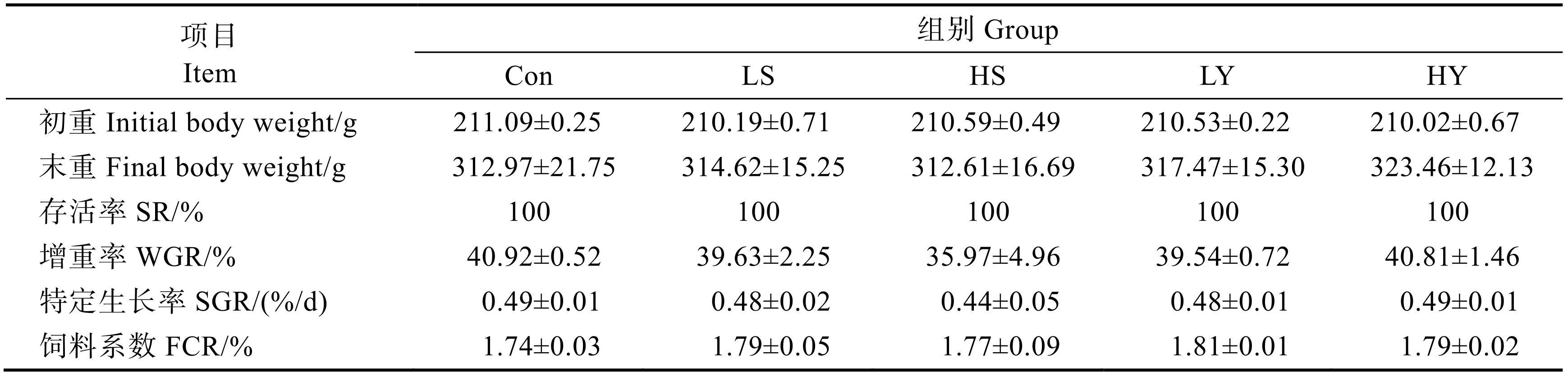实验鱼来自江西省水产科学研究所黄马基地当年繁殖的同一批苗种。实验在江西省水产科学研究所循环水养殖系统中的养殖桶(φ800 mm×650 mm)中进行,选择 240 尾体质健壮、无病无伤的彭泽鲫个体,平均初始体质量为(210.28±1.06)g,随机分为 5 组,每组 3 个重复,每个重复 16 尾。实验期间,每天 08:30 和 16:30 饱食投喂饲料 2 次,水温保持在 24~26℃,溶解氧浓度不低于 7 mg/L,pH 维持在 6.8~7.2,氨氮和亚硝酸盐浓度不高于 0.1 mg/L,光周期为自然周期。