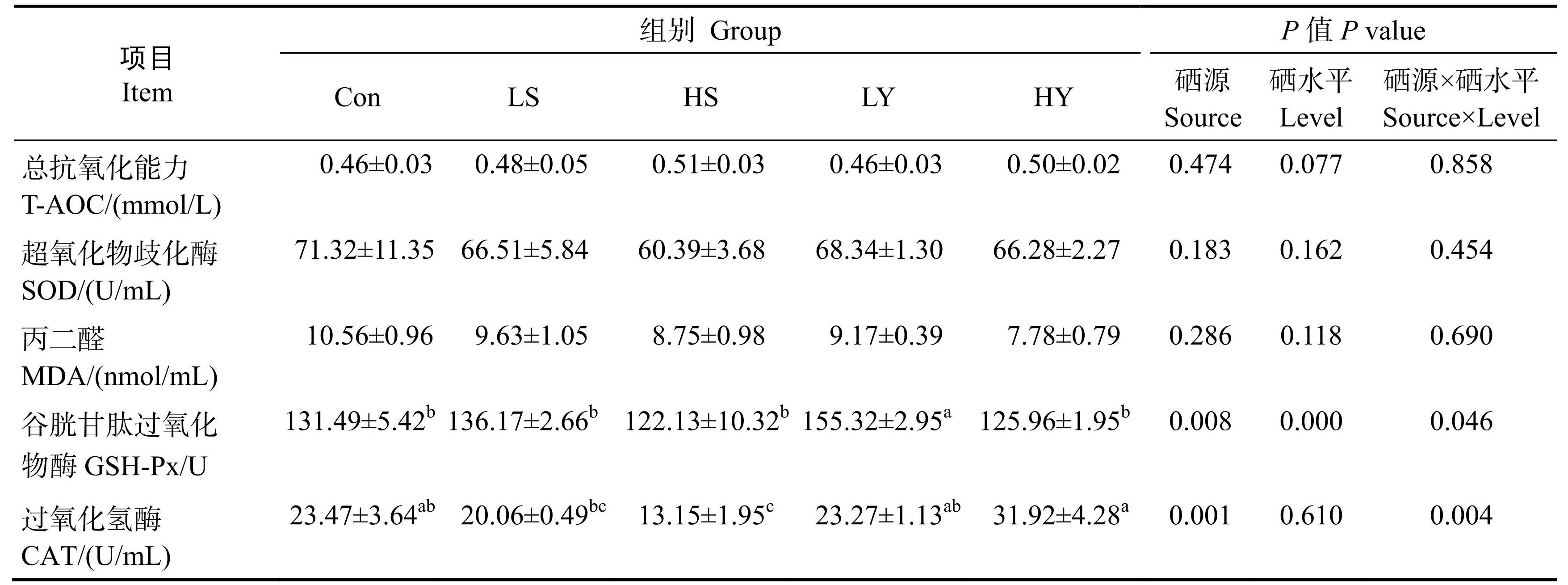 由表5可知,硒水平和硒源均显著影响 LZM 活性(P<0.05),同一硒源,LZM 活性随着硒水平升高而提升(P<0.05);且同一硒水平下,酵母硒组 LZM 活性显著高于亚硒酸钠组(P<0.05)。硒水平和硒源均显著影响 GLU 水平(P<0.05),HS 和 HY 组 GLU 水平均显著高于 Con、LS 和 LY 组(P<0.05),且 HY 组 GLU 含量高于 HS 组(P<0.05)。硒水平显著影响 CHO 水平(P<0.05),随着硒水平的升高,血清 CHO 水平有所降低(P>0.05)。硒水平和硒源对血清 LDL 水平存在显著交互影响(P<0.05)。