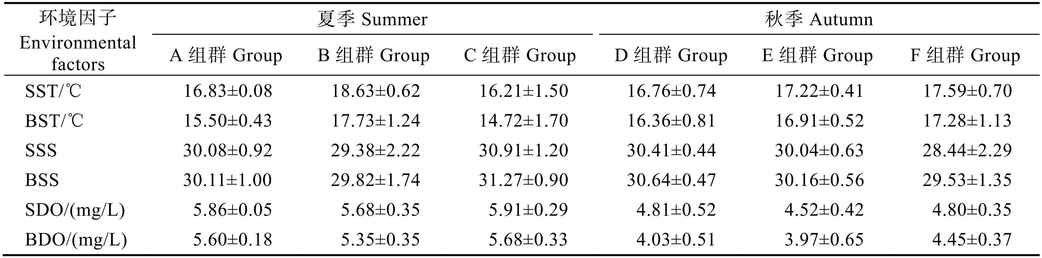表22021 年渤海海域浮游动物各组群环境因子的均值和标准差